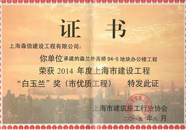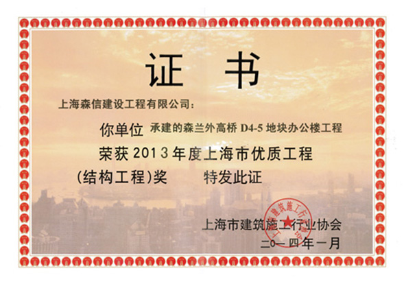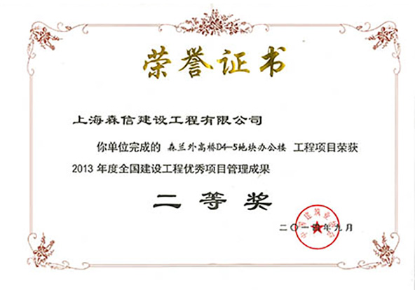 2014年森兰外高桥D4-5地块办公楼荣获全国工程建筑优秀项目管理二等奖