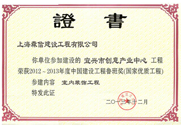 2013年12月宜兴市创意产业中心工程获得“中国建设工程鲁班奖”