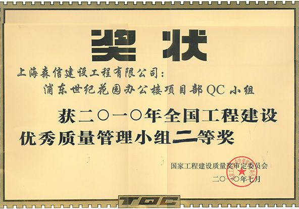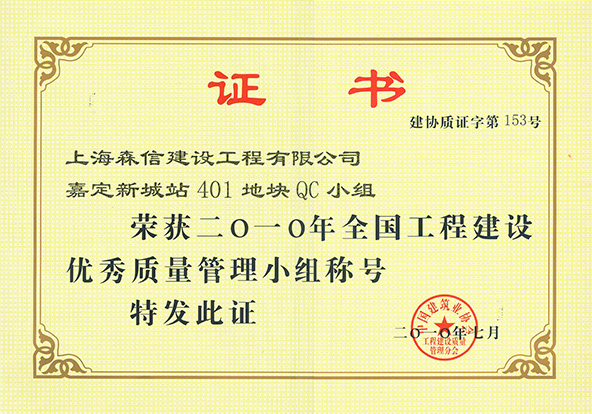2010年7月嘉定新城站401地块QC小组荣获2010年全国工程建设优秀质量管理小组称号