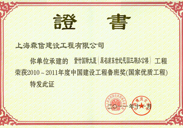 2011年11月紫竹国际大厦(浦东世纪花园办公楼)项目荣获中国建设工程鲁班奖