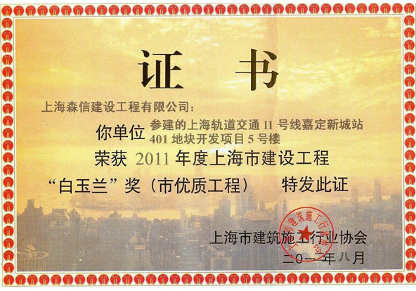 2012年8月嘉定新城401项目5#楼荣获白玉兰奖
