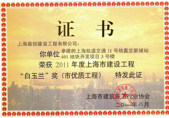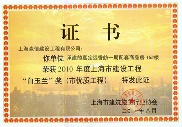 2011年8月嘉定远香坊一期配套商品房16#楼荣获上海市“白玉兰”奖(市优质工程)