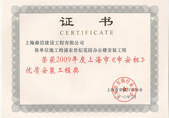 2010年3月东上海安装工程荣获2009年度上海市《申安杯》优质安装工程奖